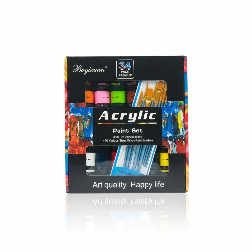 المحتويات: تتضمن 24 لونًا أكريليكيًا زاهيًا في أنابيب سعة 35 مل، و10 فرش طلاء من النايلون بأحجام متنوعة.