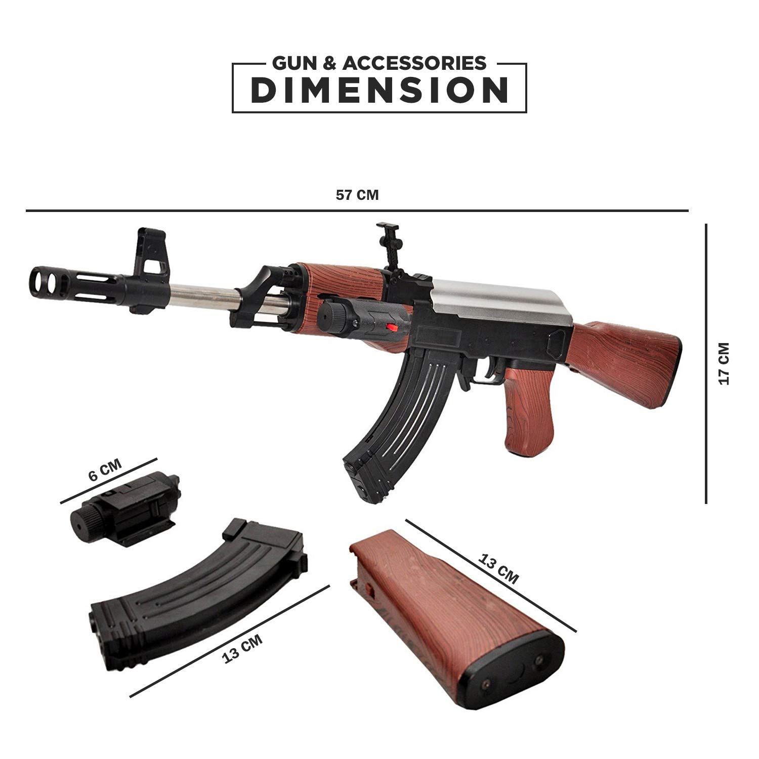 عناصر معدنية، وخطوط انسيابية، ووزن مناسب يمنح شعورًا وكأنه سلاح حقيقي، ومع ذلك فهو آمن تمامًا للعب. يناسب اليد بشكل مريح، ويقاوم الانزلاق، وهو مثالي لمعارك اللعب الديناميكية والتدريب على الرماية