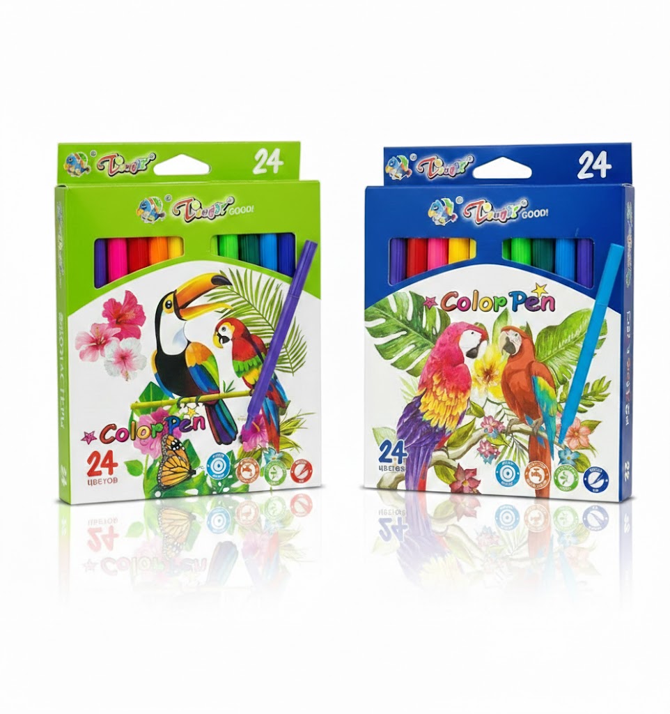طيور نابضة بالحياة على العبوة. الأقلام ذات أساس مائي ومناسبة لمشاريع الأطفال الفنية.